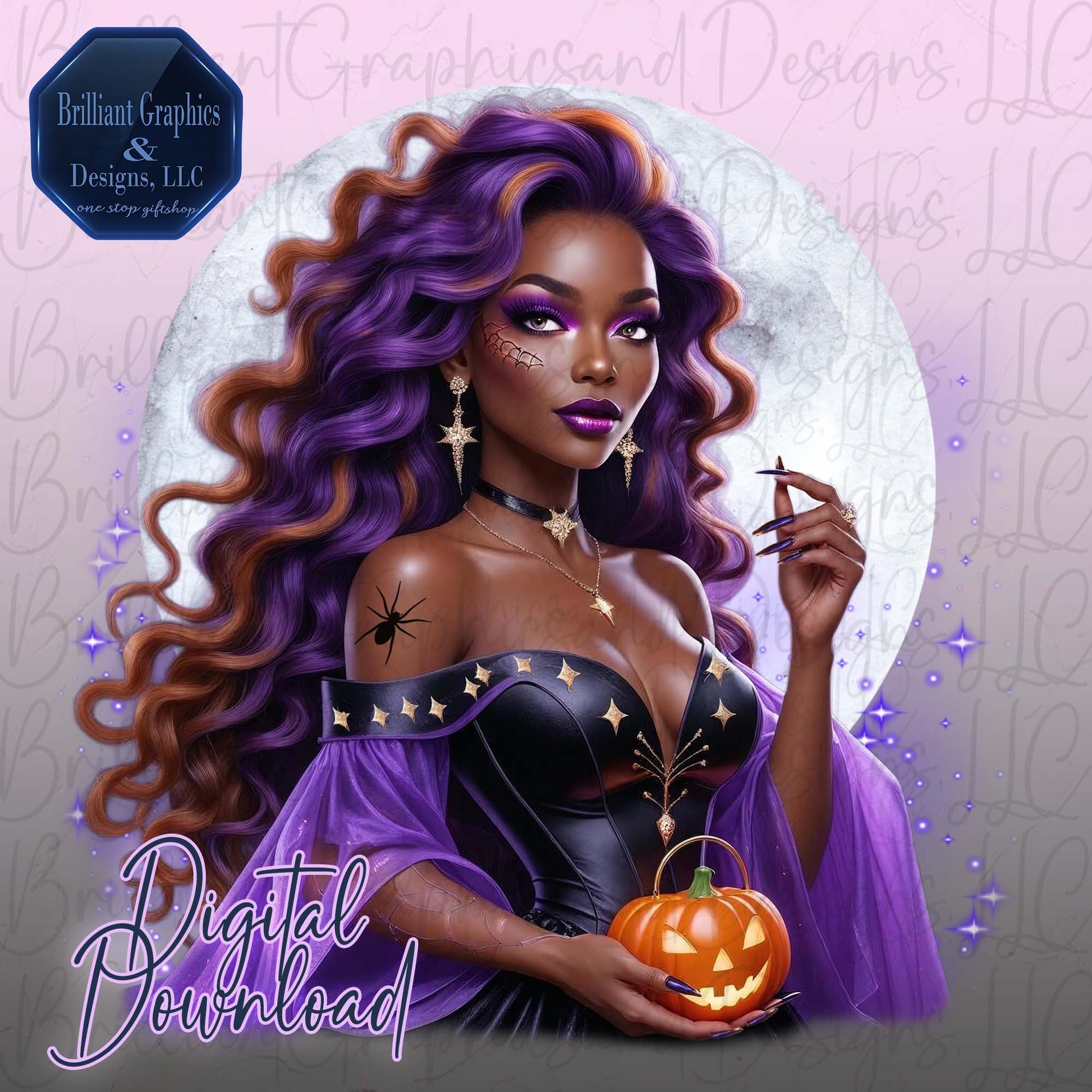 Celebrate Halloween with elegance and magic! This high-quality digital illustration features a stunning African American woman glowing under the moonlight in a flowing purple dress. With rich brown skin, soft glam makeup, and a graceful pose, she brings both mystery and beauty to your seasonal designs. Perfect for planners, sublimation projects, invitations, or digital decor.