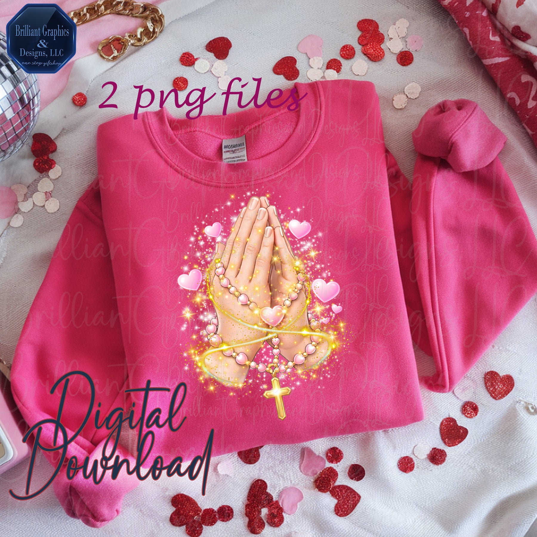 This digital set includes two high-resolution PNG files featuring beautifully illustrated praying hands adorned with a rosary, surrounded by soft pink hearts and glowing golden light accents. Designed to represent love, devotion, and spiritual connection, this reminder is perfect for Valentine’s Day creations rooted in faith.